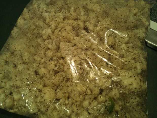 Sello de la cremallera de la bolsa, presionando todo el aire hacia fuera en el proceso como sea posible. Ahora hacer malabares con la bolsa y masaje por un tiempo, cubriendo todas las florecillas con la mugre acaba de agregar. Tenga cuidado de no romper los flósculos. Una vez que usted siente que tiene bastante uniformemente mezclado y revestido, ponerlo en la nevera durante la noche.