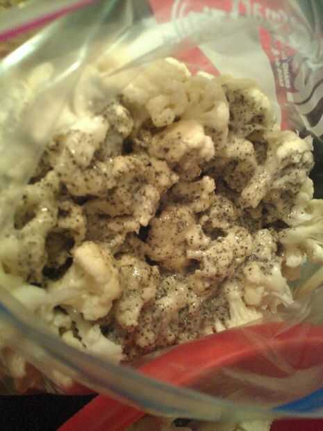 Poner la coliflor limpia y seca en una bolsa de zip de galón de tamaño y agregar lo siguiente: