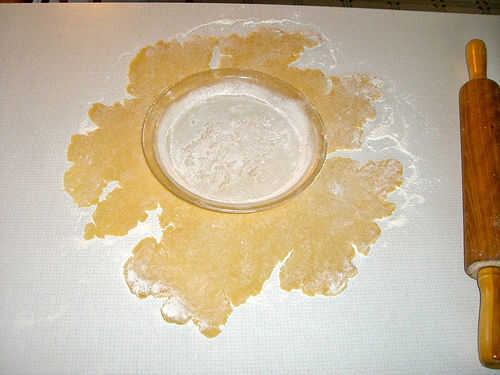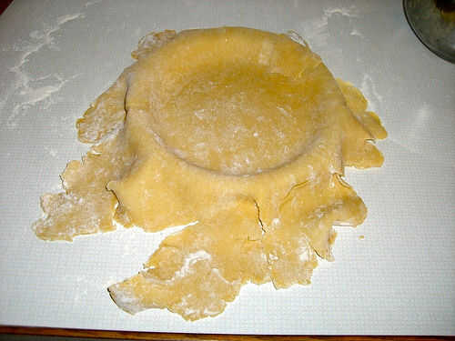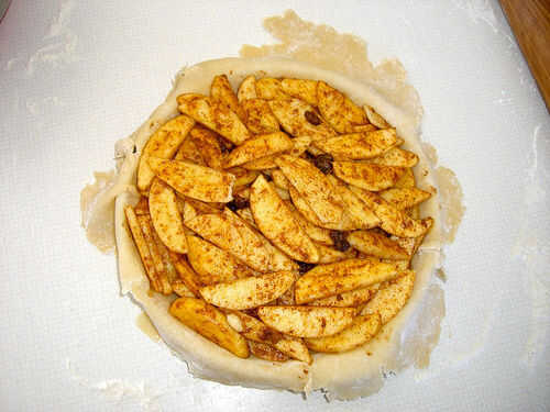 1) la superficie de trabajo y amasar la harina. Trabajar la masa enfriada en dos discos de grandes dimensiones por lo menos 11 pulgadas de diámetro y guardar la masa exceso del lado. Grasa (cocina spray funciona muy bien) y harina el molde para hornear y coloque uno en pieza en la sartén. Rellenar la tarta con el relleno de manzana.