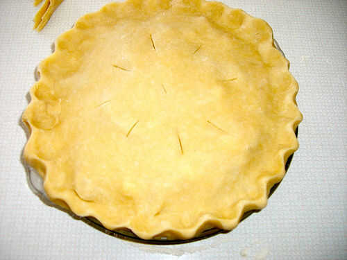 2) ponga la corteza superior de la torta, cortar la masa sobrante y guardar en plástico, remeter los bordes, la corteza de la encrespadura y cortar las aberturas en la corteza para ventilar el pie.