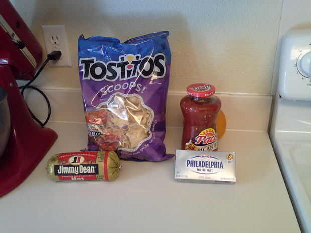 Me gusta usar Tostitos cucharadas, queso crema Philadelphia y ritmo Salsa Picante (caliente), pero funciona cualquier marca. Me gusta mi dip picante así que siempre agarro el salchicha disponible más caliente y la salsa.