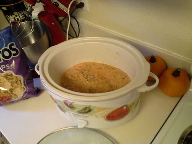 Una vez que todos los ingredientes se mezclan, transferir la inmersión en la olla y en alto.  Deje el dip cocinar dentro de la olla para acerca de 20-25 minutos.  Después de 20-25 minutos, coloque la olla a calentar.