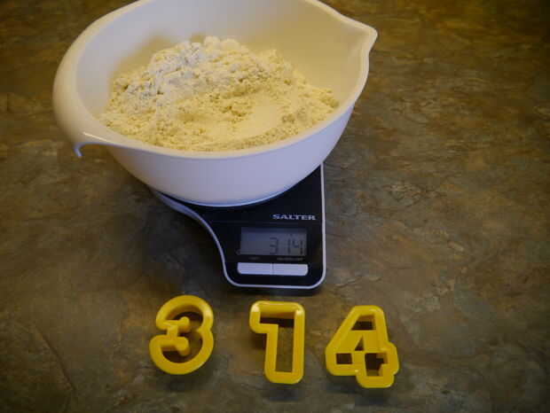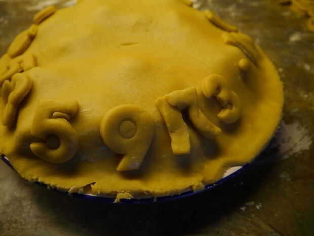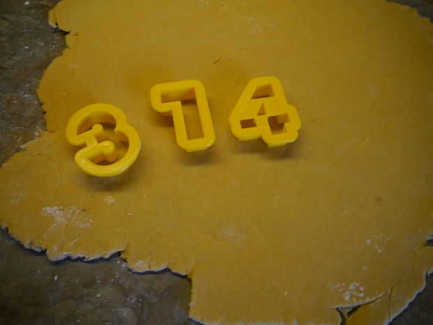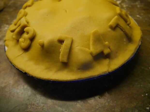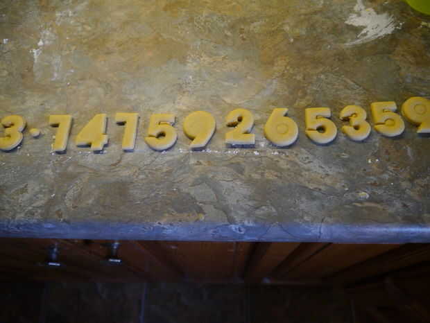 10. aplastar los adornos en forma de bola y rodillo hacia fuera plana. Usando las cuchillas número, recortar el número de pi, la circunferencia del pastel va a determinar cuántos dígitos tendrá.