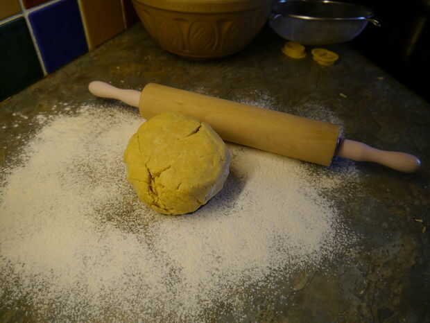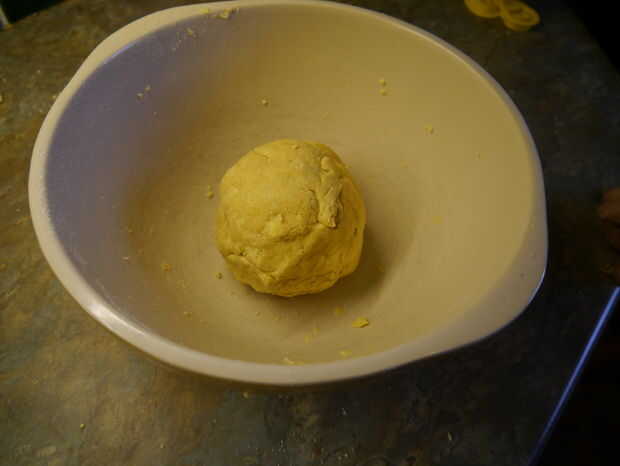 4. una vez la masa ha llegado juntos, se reúnen en una bola y girar hacia fuera en una superficie de trabajo enharinada.