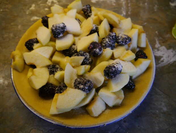 8. Arme las manzanas y las moras en la base de la tarta. Tratar de estirar como uniformemente como sea posible.