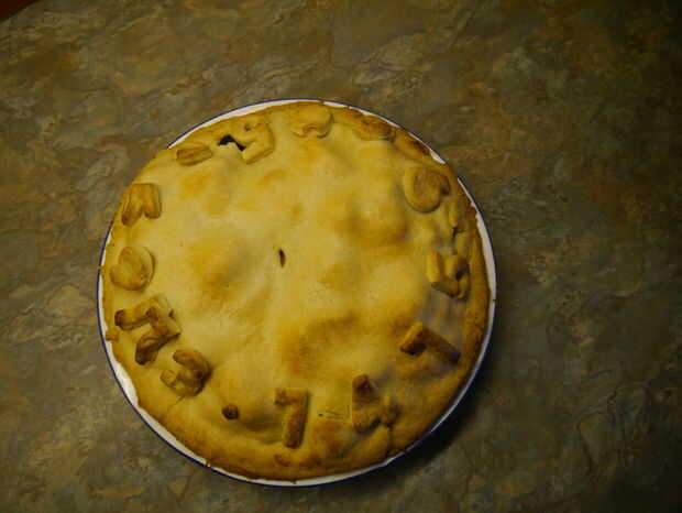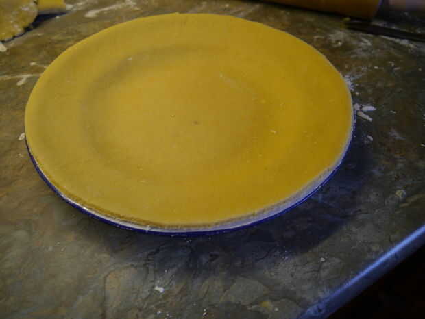 9. estirar la otra mitad de la masa y cubrir la fruta. Una vez más, recortar el exceso.