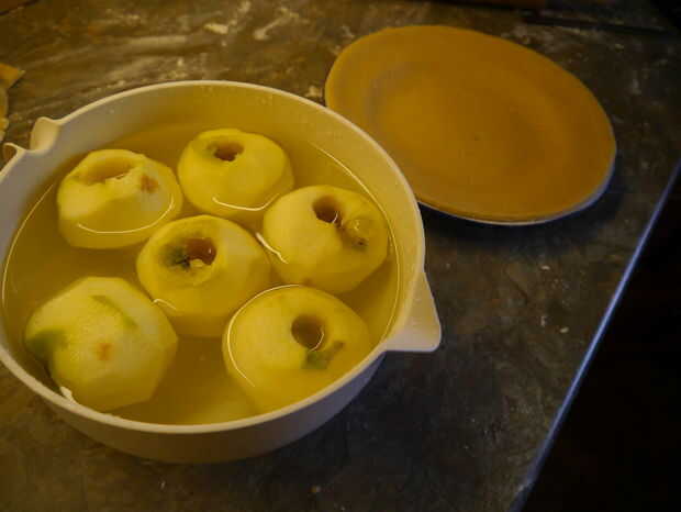 7. ahora, Pele, núcleo y trocear las manzanas y secarlas sobre un paño de cocina. (Esto dejará la base de la tarta de llegar empapado!)