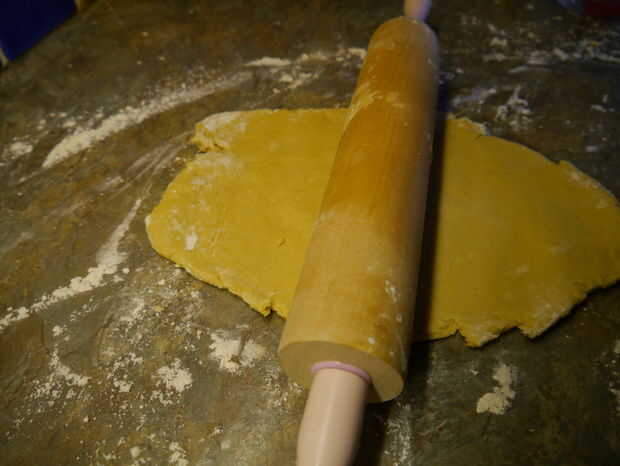 6. usando un rodillo, rodillo hacia fuera una mitad de la masa a 1cm de espesor. Extiende sobre la lata de pastel y luego cortar los bordes con un cuchillo de mantequilla. Cambialo a un lado.