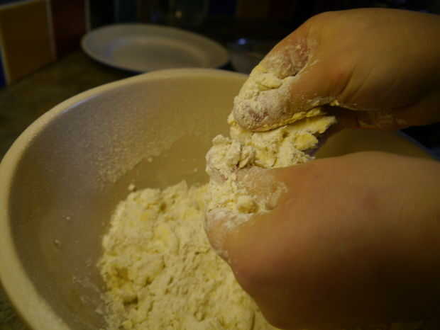 4. hacer un pozo en el centro de la taza y gradualmente agregar el agua fría, mezclar entre cada adición (puede utilizar las manos para hacer esto)