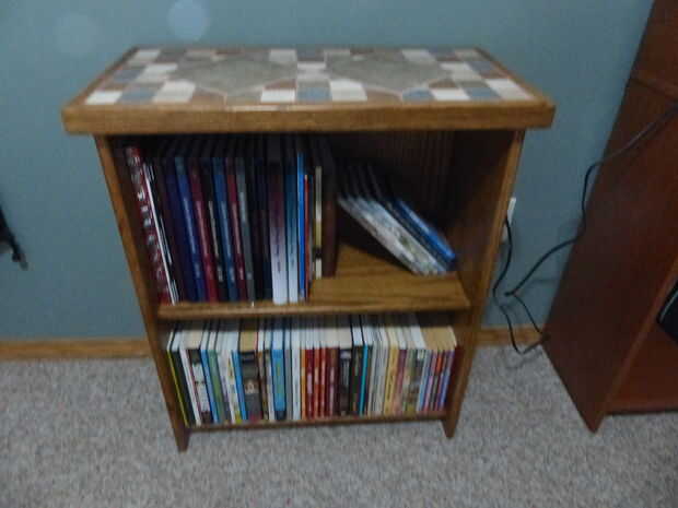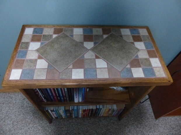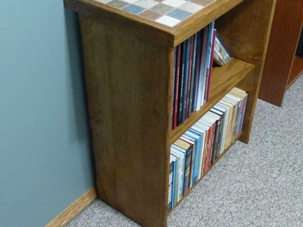 construí esta estantería en mi tiempo libre, y no cuesta mucho o tomar mucho tiempo. El funcionamiento de madera era muy simple (solo seguí los planes). Había hecho de roble y había terminado con la mancha roble dorada. Elegido unos azulejos por Tótem ($20-$30) y colocó en la parte superior, al ras con el guarnecido. Elegí un diseño que me gustó mucho, pero puede tener cualquier arreglo de azulejos que desee. Una vez que se pegan los azulejos, lechada entre ellos y una vez que la lechada se secó, pasar y estaba acabado. Era bastante fácil de hacer, muy barato costo de sabio, no pasó mucho tiempo y se ve bien.