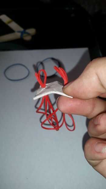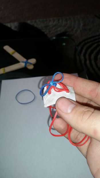 Una banda de caucho a la vez, utilice el lado embotado de un palillo de dientes (o algo equivalente) a 2 grandes bandas de goma a través de cada agujero en el bolsillo de papel, alrededor de un cuarto de la longitud de la goma elástica a través (como se ve en las dos primeras fotos). Una vez instaladas todas las 4 grandes bandas de goma, utilice una pequeña banda de goma para unir las grandes bandas. Para ello, cortar o dejar intactos una pequeña banda de goma (su hasta usted). Inserte en circuitos de grandes bandas de goma en el lado corto de la bolsa de papel. Haga un nudo con la pequeña banda de goma. Tire de grandes bandas hasta que el nudo esté centrado y que no esté en el lado corto. (como se ve en la tercera imagen).