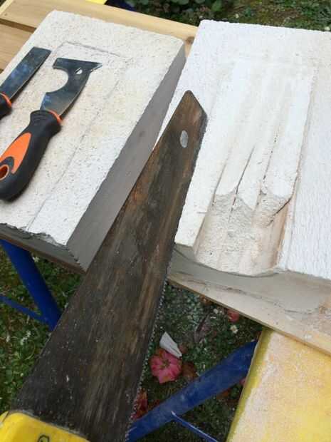 Me pareció que la mejor manera de cavar hacia fuera hacer algunos cortes paralelos con la sierra y luego romper grandes trozos de él y luego raspar y alíselo con la espátula.