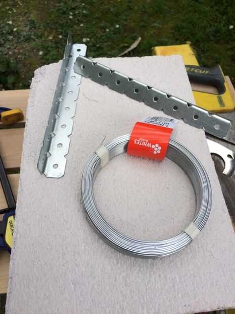 Tengo algunas pequeñas escuadras en la ferretería. Tenían estos larga por $2 y algunas cortas del tamaño que necesitaba para $1,75. Como necesitaba 8 escuadras, y pude cortar dos de los soportes de largo para hacer los pequeños 8, tengo las largas. También tengo algún alambre del lazo - este alambre es galvanizado que generalmente es un no-no grande con todo lo que se calienta. Quema de cinc produce vapores tóxicos. El exterior de este horno no va a calentarse lo suficiente para que esto sea un problema.