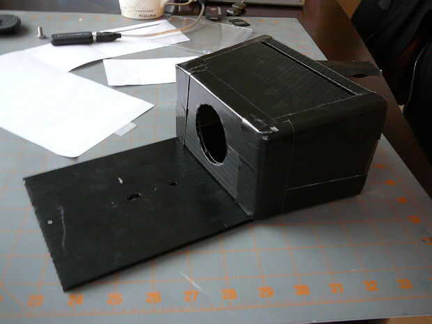 Esta debajo de la caja de agua para una cámara réflex digital está hecha de una caja de estancas de Wal-Mart y piezas de plomería de Home Depot.  En total creo que el costo de "profundizar" (bien 6' o algo así) era menos de $40,00 y las fotos so
