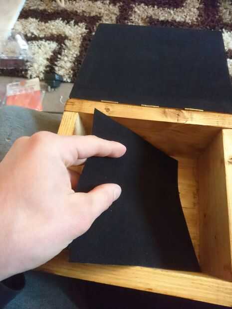 También compré 2 hojas a4 de terciopelo de negro/fieltro adhesivo auto 99 p poner en la parte inferior de la tapa (dobles accidentalmente para arriba como un cierre suave para la tapa) y la base de la caja.