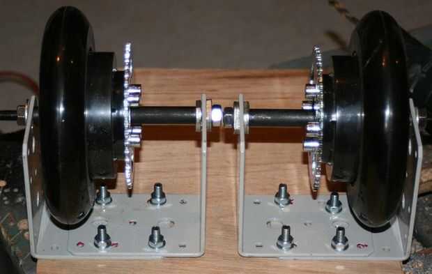 Aquí están las ruedas equipado y empernado hasta el tablero. Nota que si desea la distancia entre ejes de ancho mínimo, en cuanto a un auto equilibrado patín luego puede recortar los extremos interiores de los árboles como lo he hecho aquí.