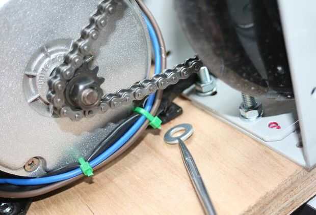 Colocar arandelas debajo de agujeros internos de 2 tornillos para el motor. Esto levanta el motor un poquito y holgura de la cadena es tomado.