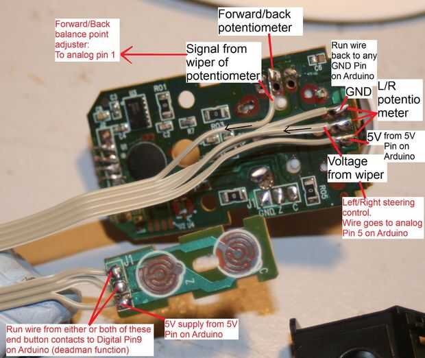 Nota: Los extremos de las pistas internas de cada potenciómetro se unen por la placa de circuito se sueldan, así que sólo tienes que conectar un cable de 5V de Arduino y una toma de tierra a uno de los dos potenciómetros de alambre y luego ejecutar 2 hilos más (uno del limpiador de cada potenciómetro) volver a los pines de entrada analógicos en el arduino.