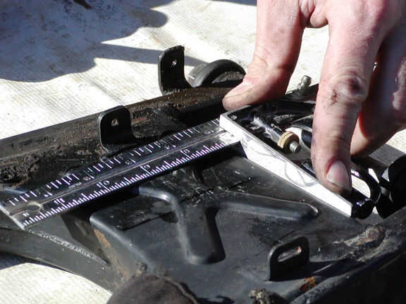 Este paso requiere precisión - el motor debe quedar perfectamente en línea con la rueda trasera, para que la cadena viaja directamente entre ellos sin ninguna flexión o torsión causados por mala alineación. Se utilizan un cuadrado y la regla para marcar las líneas de corte con precisión.