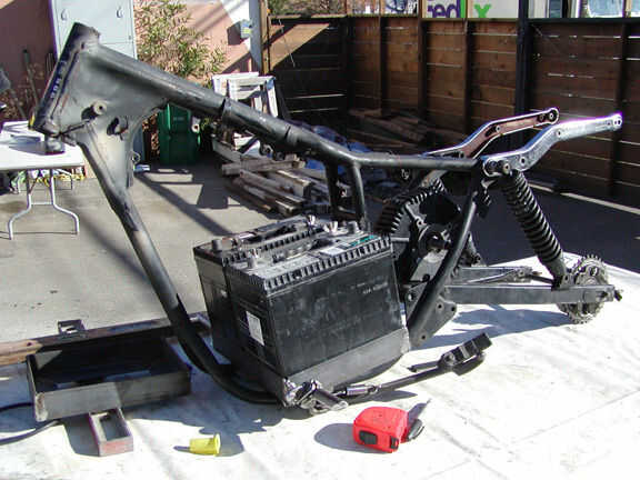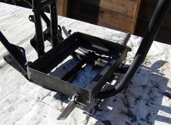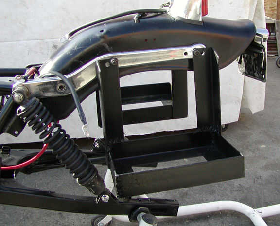 El diseño original para las bandejas de la batería utiliza carnosos 2" hierro de ángulo para asegurar que puede apoyar el peso (unos 50 kg. cada uno). Esto no fue una gran elección. Añadido más peso entonces necesaria. Un rediseño de la bicicleta utiliza las baterías un poco más pequeñas, que ayudaron de varias maneras.