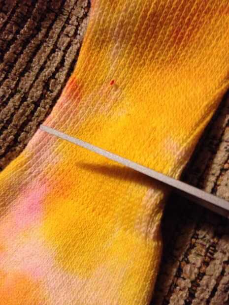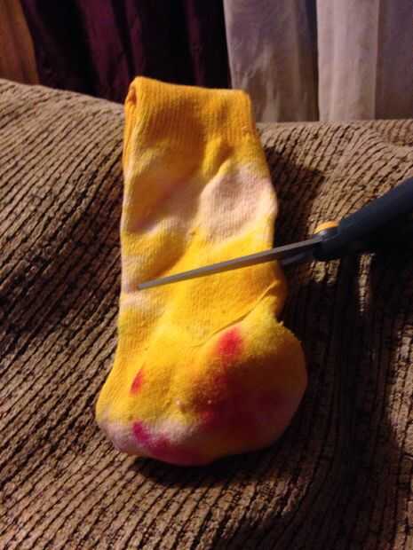 También necesita cortar el otro extremo. Te recomiendo cortar aproximadamente 1/2 pulgada de la "banda" del calcetín por la parte inferior de la tapa.