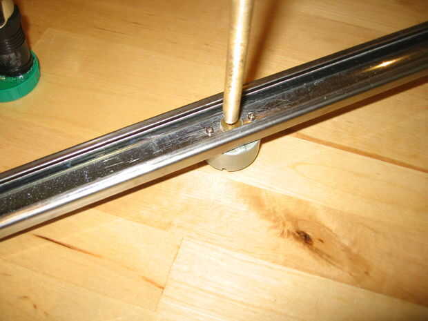 Lo siguiente es conectar el motor a la dirección apoyo. Mi runner inoxidable cajón tenía un gran agujero que sólo necesitábamos ampliar ligeramente con un archivo. Dos pequeños agujeros para los tornillos y el motor está listo para montar.