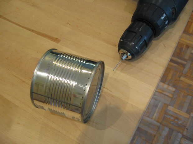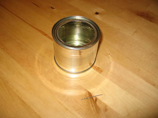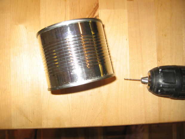 Primero-para arriba cortamos un agujero en la parte superior. Lo hice con recortes de lata y un archivo para dejar un labio para que el azúcar no podría salir de la parte superior. En la práctica que parece haber sido innecesaria, por lo que un abrelatas cortar al principio hacia fuera estaría bien. De cualquier manera, suavizar los bordes afilados para evitar lesiones.