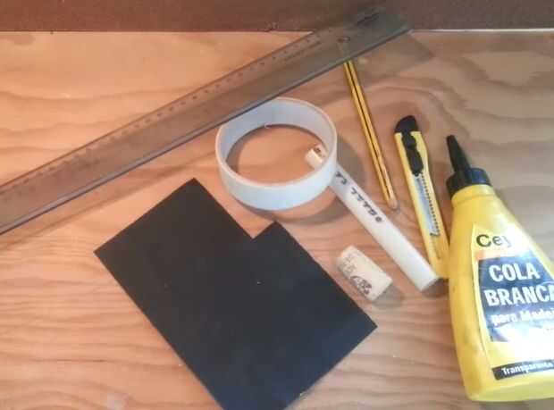 Lista: Lixa, tubo plástico, cola para madeira, fita de pintura (papel) e rolha de corcho.