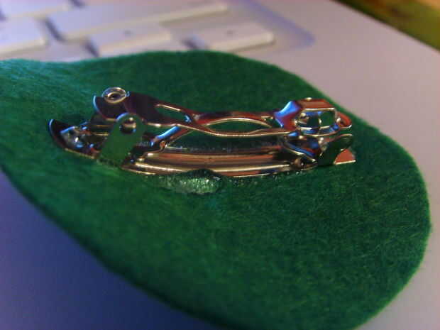 5. poner pegamento en el pasador de pelo para poner la flor de fieltro. Pulse en él durante unos segundos hasta que esté casi seco para mantener juntos.