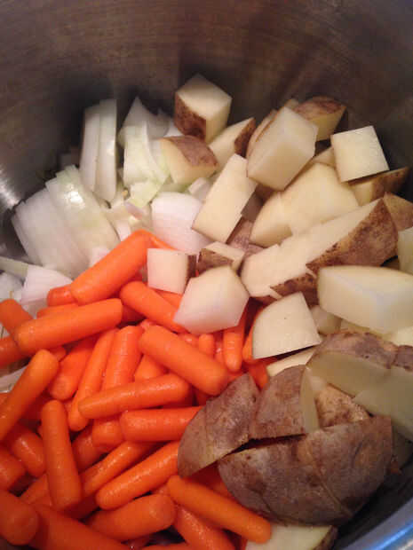 1. Picar la cebolla y las patatas en trozos tamaño bocado. Puede dejar la piel en las patatas o quitar dependiendo de su preferencia. Si está añadiendo apio o Romero, les preparación en este tiempo también. Añadir todo a la olla grande.