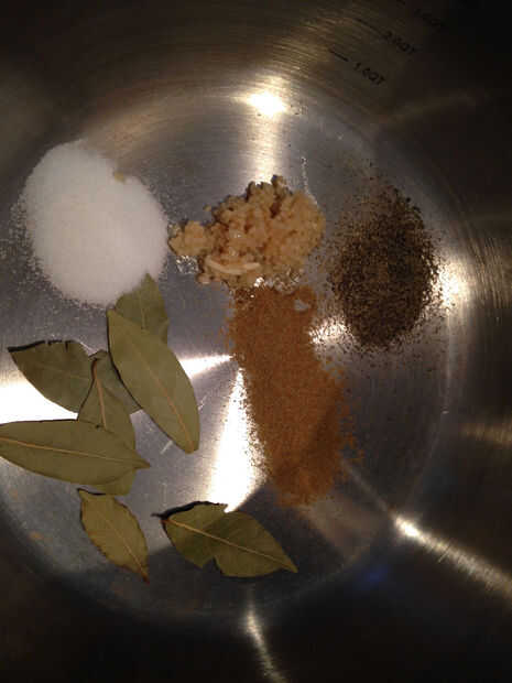 2. Deje caer unas cuantas hojas de laurel, por lo menos 1tbs de comino, sal, pimienta y el ajo en la olla grande así. La cantidad de especias es realmente depende de ti, pero tienes una buena cantidad de cada uno para ayudar a sabor el plato mientras se cocinan.