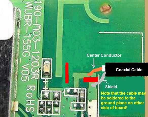 La idea básica es que usted necesita soldar un cable entre la salida de RF de la Junta de la WiFi y el elemento conducido de la antena yagi.