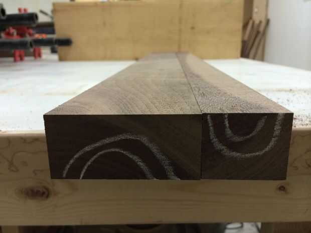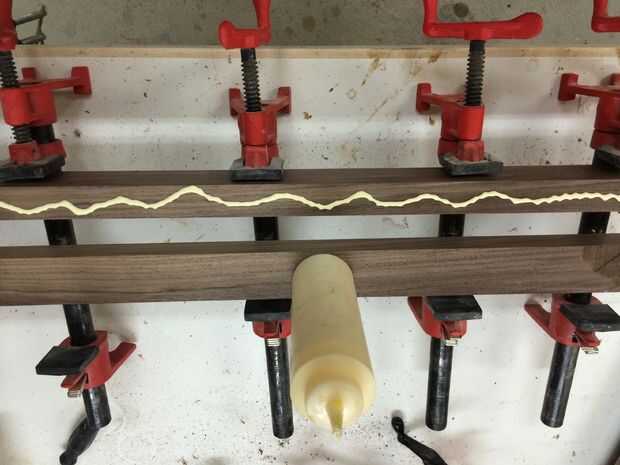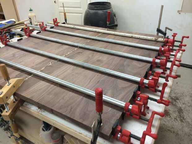 1. usar joiner y cepillo para placas de 3" a 5" tableros grandes. Espesor debe ser 1/16 más que el espesor final. En este caso sería 1" 5/16. Laminado con abrazadera para tubería. Objetivo de 12" a 13" Junta (máxima con cepillo). No te olvides inversa anillos de la madera para una máxima estabilidad.