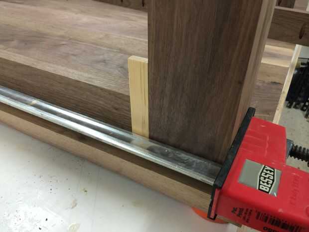 Coloque las piernas y camisa en tablero de la mesa. Uso 1" tiras como guía para colocar la pierna sobre la mesa. Este método es la "prueba falsa" y harás que tú pierna estén centrados.