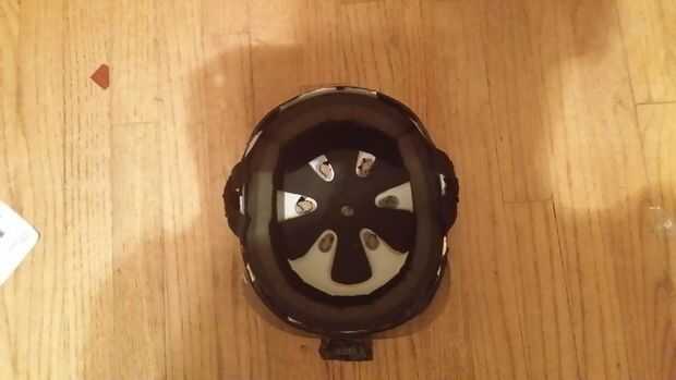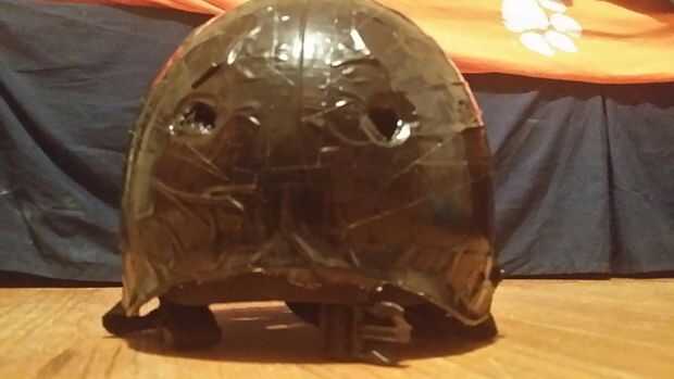 cubrir el casco de skate toda junta en cinta del pato negro. construir el cilindro legos para parecerse a un láser. (debería ya haber agujeros en el casco real) luego meter el pato para destapar los orificios de