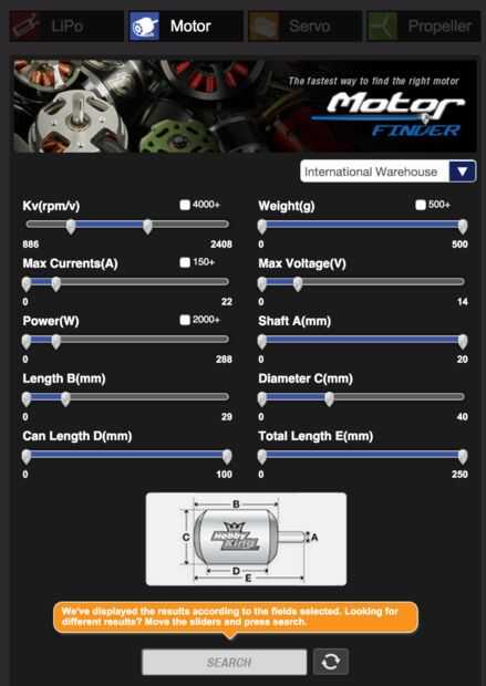Para obtener una lista con los mejores motores posibles he utilizado el motorfinder de hobbyking, Compruebe la foto para ver qué configuración he utilizado.