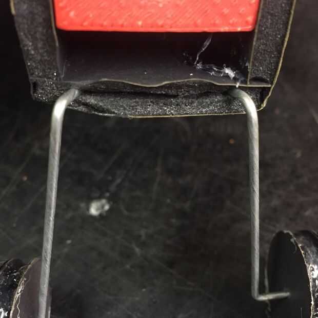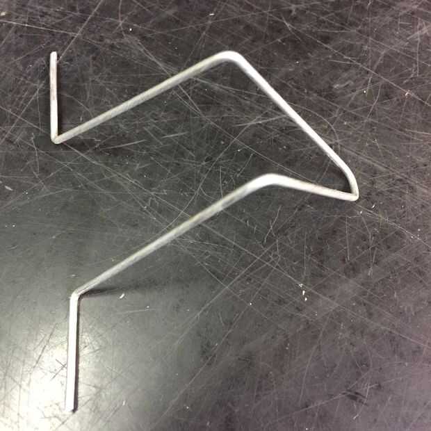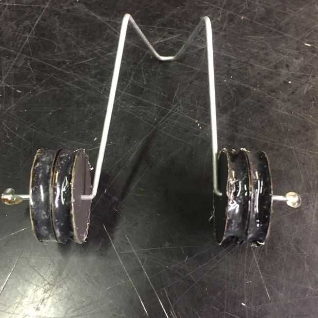 Doblar el alambre de metal en forma de V, y unos 4 cm. de la v. agacharse la perpendicular del cable. Unos 5 cm hacia abajo la curva les recta para que las piezas recién dobladas están alineados entre sí. Coloque las ruedas en el alambre y agregar pegamento a los extremos para que las ruedas no caiga.