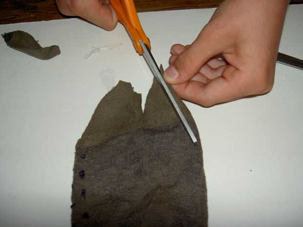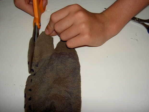 En la puntera del calcetín hacer un corte en el centro cerca de una y dos pulgadas. Luego corte cada lado del dedo del pie para hacer un triángulo.