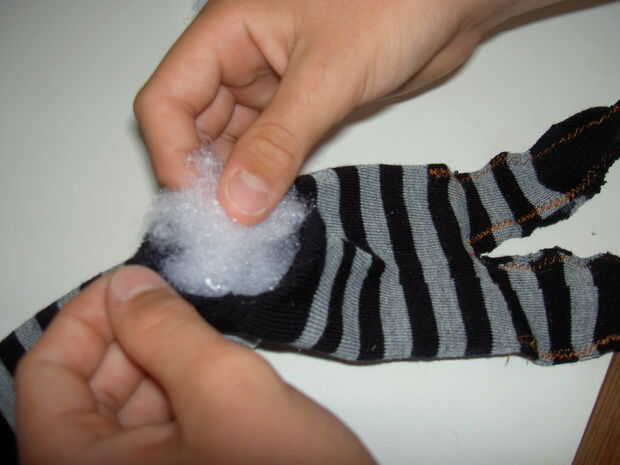 Monstruo de cosas por la boca empuja el relleno hacia abajo de las piernas. Un lápiz ayuda a conseguir allí. Rellenar el área del vientre entonces llene último los cuernos.
