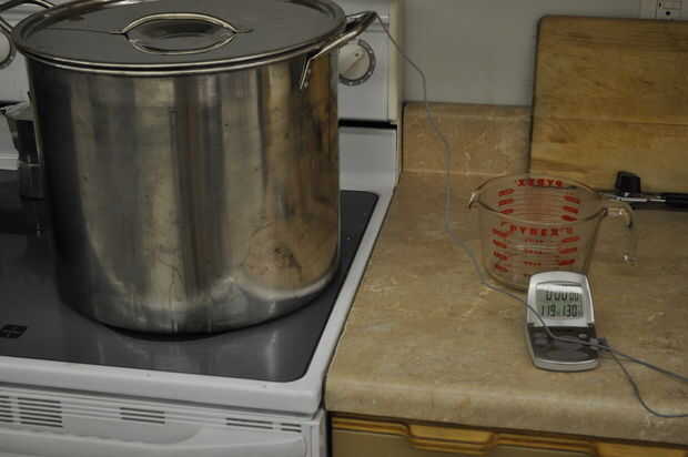 Añadir agua caliente (ideal caliente suficiente para golpear a unos 120 grados, pero francamente nunca he tenido un problema con agua caliente en este momento) para cubrir, hasta profundidad de una pulgada o dos. Ponga el termómetro en la punta de prueba y ajustar la alarma (si tiene uno) a 140. Luego, encienda la estufa.