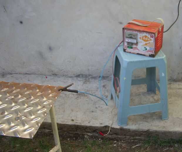 Utilicé como un trabajo de la mesa un trozo de hierro hoja de , que une la pinza negativa del cargador de batería. También se puede conectar directamente para fijar la pieza a ser galvanizado.