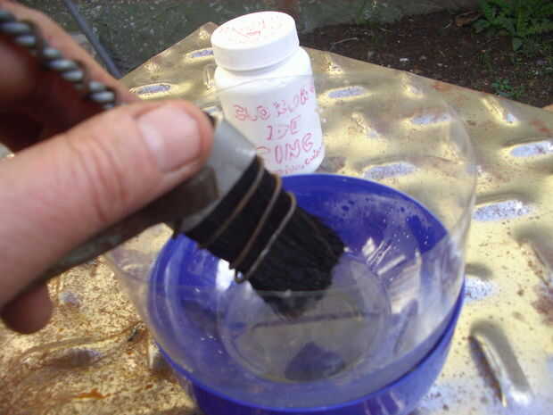 Conecte la pinza positiva (generalmente marcada con rojo) para el cepillo mango, asegurándose de que los contactos también el cable que viene cerca de la punta de las cerdas. Sumerja el cepillo en la solución de cloruro de zinc, encienda el cargador y cepillo lentamente la pieza. Asegúrese que el cable que agregó en el paso 4 no toque la pieza, ya sería cortocircuito produciendo la chispa correspondiente. No es peligroso pero puede causar sobrecalentamiento del cable o cargador. Si la alimentación es un cargador con amperímetro, asegúrese de que cuando se cepilla la pieza el amperímetro se mueve, que indica que los flujos actuales. De lo contrario, es que el circuito se interrumpe en un lado. Esto puede ser porque la solución no sumerja el cable, o tal vez algunas de las abrazaderas no hace buen contacto. Inmediatamente se puede ver que el cinc cloruro deposites una capa de zinc en la pieza, como si fuese una pintura. Al mismo tiempo se observará una ligera efervescencia en la punta del pincel. Si la temperatura es demasiado alta, es que usted está solicitando demasiado poder. No molesta, mientras que la temperatura no es tan alta que es difícil de manejar. No dependen de esa primera capa de zinc, porque incluso si se ve un perfecto gray, es extremadamente fino y no resistirán la humedad más de unos pocos días. Es necesario pasar el cepillo muchas veces sobre cada lugar, para que el espesor de la capa adquirir confiable. Esto es a su discreción, dependiendo de la importancia de la pieza a proteger. En mi caso, siendo una demostración, hice mi mejor también. De todos modos, estuve unos 10 minutos insistiendo, creo que esa llave oxidada vieja una vez desenterrada del suelo va a durar unos años más.