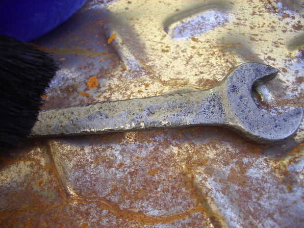 No confiarse at esa primera capa de cinc, porque aunque se vea de perfecto de un color gris, es sumamente delgada y no resistirá la humedad ambiente más unos pocos días. Es necesario pasar el pincel muchas veces por cada lugar, para la capa adquiera un grosor confiable. Esto queda a criterio de cada uno, depende de la importancia de la pieza a proteger. En mi caso, tratándose de una demostración, no me esmeré demasiado. De todas maneras, estuve unos 10 minutos insistiendo, por lo estimo esa vieja llave oxidada alguna vez desenterré del suelo va a durar unos cuantos años más.