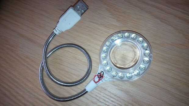 Búsqueda eBay "lupa flexible LED luz portátil" y encuentra docenas de anuncios de estos útiles pero increíblemente baratos dispositivos. Deben ser unos cuantos dólares ($3-4) con envío incluido! Ver foto del tipo que debe recibir.