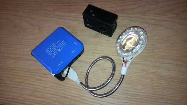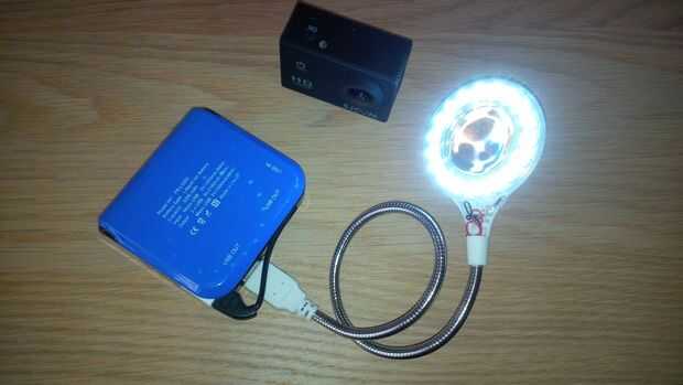 Enchufe su luz en la salida USB del Banco de la energía y encender el Banco de la energía y la luz. Usted debe conseguir una luz brillante y ahora puede colocar la luz de una manera para que pueda equilibrar su cámara. Si usted está preocupado, utilizar unos elásticos para sujetar la cámara. También asegúrese de que la cámara está en el centro de la luz del anillo donde la lupa tiene la menor distorsión.