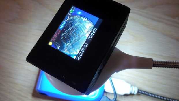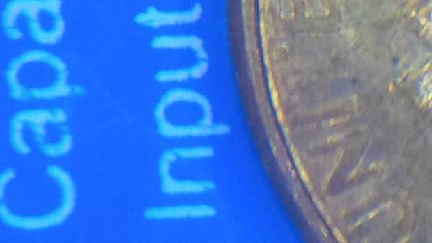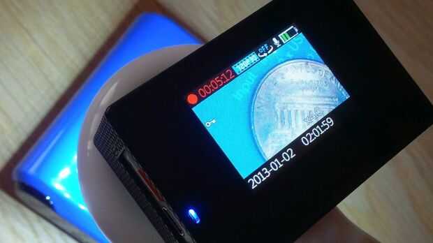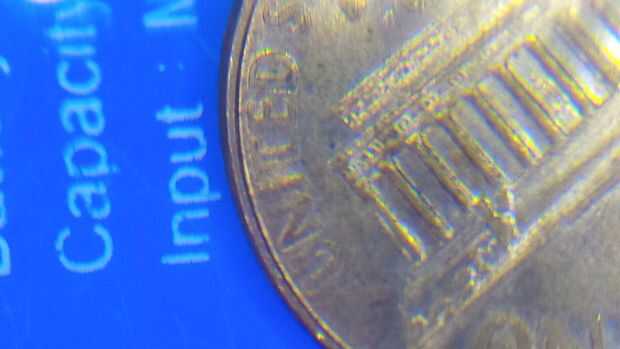 Como se puede ver en las fotos, he puse un centavo en el "escenario" hecho por el Banco de la energía. Puedo ampliar y enfocar moviendo el anillo de luz y ajustar el factor de zoom de la cámara de acción. La escritura en la etapa ayuda a centrarse. Si no tienes esto, simplemente use un pedazo de papel o billete de dólar u otro objeto delgado con marcas finas para que puedan ver si las cosas están en foco.