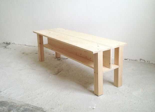 En la ferretería de la ciudad, encontré unas tablas de madera listos para usar. Diseñé mi banco combinando cuatro de esas placas sin modificaciones. Gracias a la inferior, la construcción es muy estable.