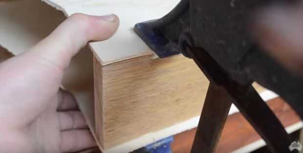 Ahora es el momento para pegar los lados. Lo más importante es conseguir los 2 extremos que usted corte alineado. Cortamos la capas de gran tamaño para que sobresalga hacia fuera. Esto puede solucionarse con un router después.