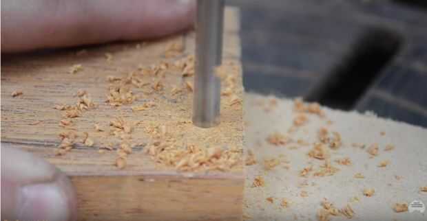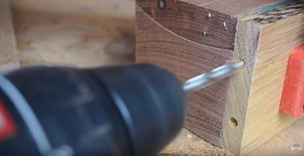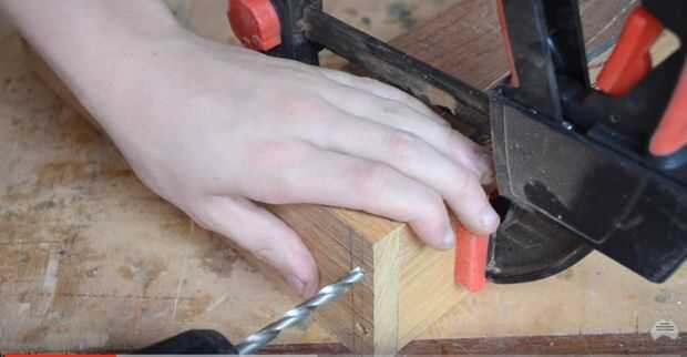 Ahora perfore 2 agujeros por fin en las piezas de 335 mm. El dowls debe ser la mitad del ancho de materal en desde el borde. Con un taladro pero para acomodar su dowl Taladre los orificios en el taladro. Con los agujeros perforados Sujete la otra pieza a un tablero que sabe que es un ángulo recto y la pieza previamente perforada para alinear la broca y perforar. No te olvides de marcar las juntas para que usted sepa qué piezas van juntos.