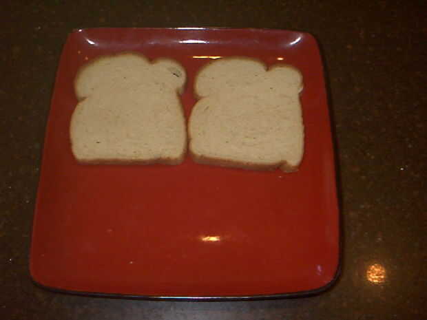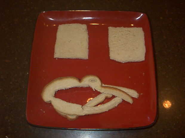 Necesita dos suaves trozos de pan blanco. Cortar la corteza bien con unas tijeras o un cuchillo. Asegúrese de que cortarlas en cuadrados algo iguales.